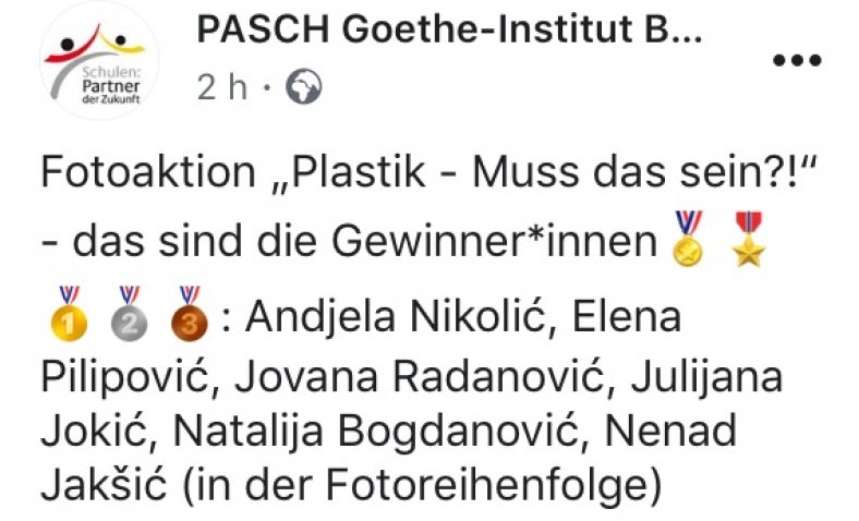 Све похвале и за остале ученике (Хелену Шкипину VIII1, Јовану Павлевски VIII1, Екатарину Радић V3, Александру Савић V5 и Ђорђа Стојановића VII4) који су путем слика, коментара и порука на немачком језику скренули пажњу на проблеме заштите животне средине и пробудили еколошку свест.